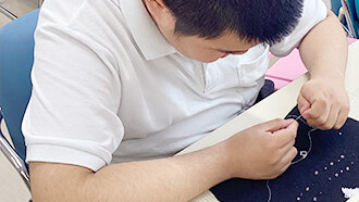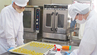 食品を作る上で大切な衛生面に気を付けながら、メンバー全員で取り組んでいます。お菓子作りでは生地作りから始まり、型抜き、袋詰めをします。メンバー全員で協力し作ることで、協調性が身に付くようにしています。