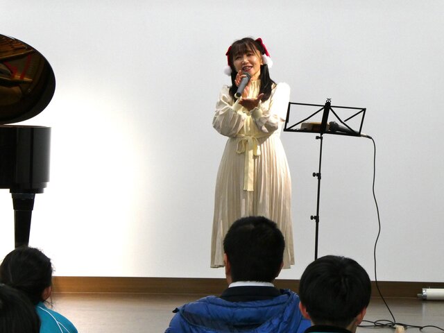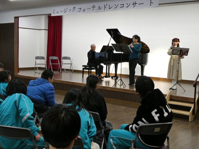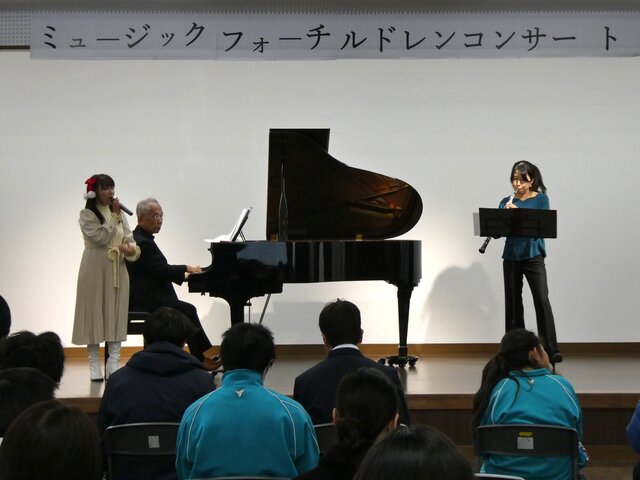 令和6年12月10日(火)にミュージックフォーチルドレン コンサートが行われました。ミュージックフォーチルドレンのみなさまには、毎年コンサートを開いていただいています。今年は、ピアノ、オーボエによる演奏と歌を披露していただきました。たくさんのリクエストに応えていただきました。普段聞くことのできないプロによる素晴らしい演奏、澄み渡る歌声に、自然と体でリズムをとる人、音楽に聞き入る人、それぞれの楽しみ方で音楽を満喫することができました。ミュージックフォーチルドレンのみなさま、貴重な経験を大変ありがとうございました。