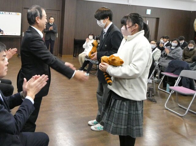 代表取締役副頭取 櫻井 裕之様より。生徒代表2名にラスカルのぬいぐるみを贈呈していただきました。 -