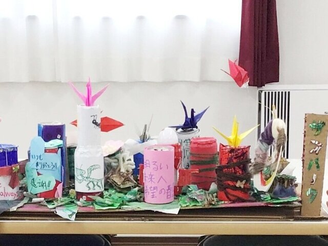 作品は3月の美術の時間に、生徒みんなで力をあわせて「春」をイメージし、制作しました。今回は2作品が完成し、どちらも手の込んだ力作となっています。3月24日に、展示準備として、作品を学校から運び出しました。