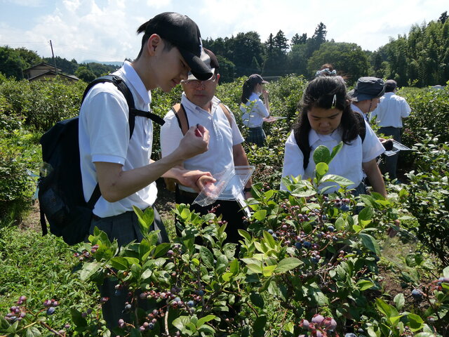ブルーベリー狩りを体験しました。学校でもブルーベリーを育てているので、お手入れ方法を教えていただきました。