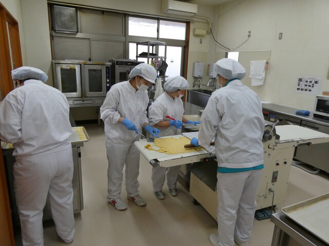 食品製造コースの作業学習でクッキーの型を抜き、鉄板へ並べました。お互いに協力して作業を行いました。 -