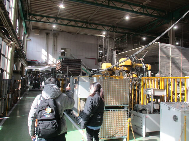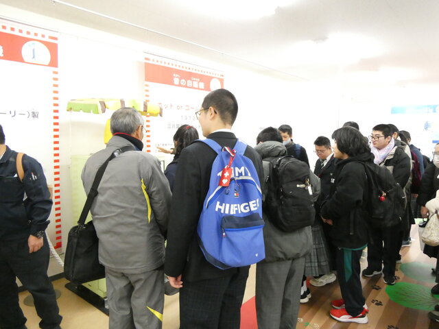サンデンへ行き、自動販売機の種類や仕組みのお話を聞きました。生徒たちは、興味津々でした。 -