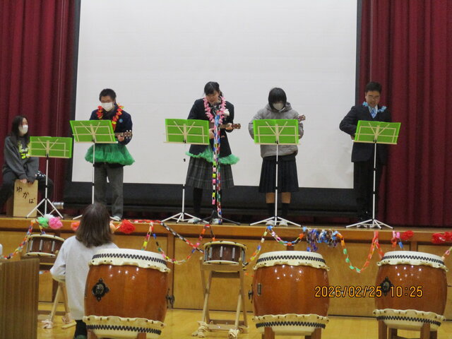 毎年恒例の「卒業生を送る会」が2月25日に開催されました。月田小学校の6年生を招いて、卒業生を送りました。どの生徒も自分の力を出し切ったパフォーマンスを披露することが出来ました。音楽クラブのウクレレ演奏に始まり、運動部のダンス、若葉和太鼓部の和太鼓演奏が披露されました。さらに本科1年生はそれぞれの生徒が創意工夫を凝らした出し物を行い、本科2年生は劇とダンスをセットで披露し、専攻科1年生は3つのダンスに加え、歌も聞かせてくれました。そして月田小学校6年生のみなさんが卒業生を祝うべく合唱をして下さいました。改めて卒業生のみなさん、ご卒業おめでとうございます。