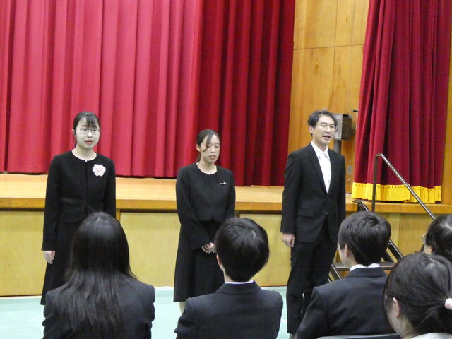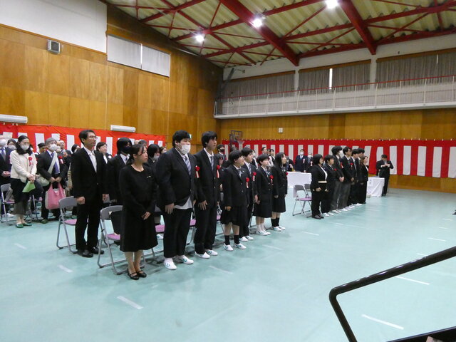 生徒、教職員による校歌斉唱。新入生は、初めて歌う校歌です。早く覚えましょう。 -